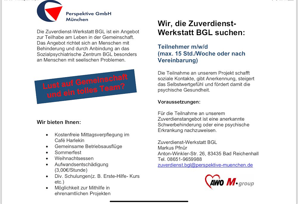 Die Zuverdienst- Werkstatt- BGL ist ein Angebot für Menschen mit Behinderungen zur Teilhabe am Leben in der Gemeinschaft.