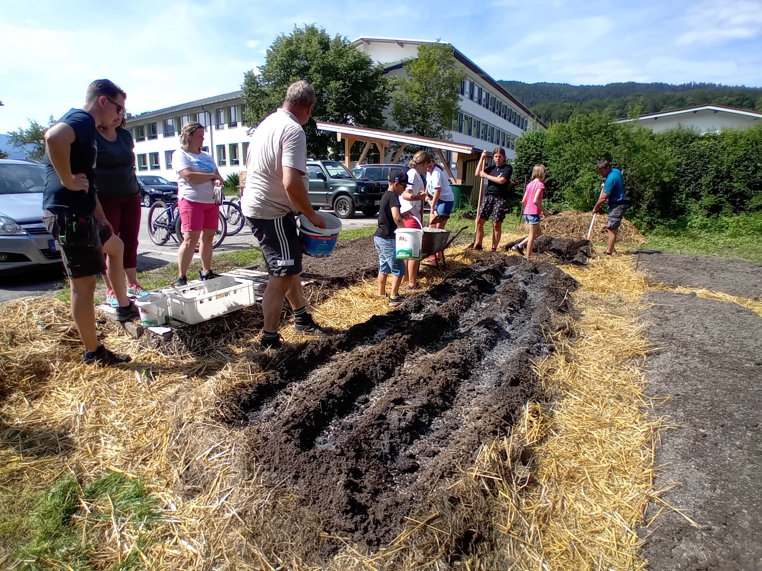 Weitere Unterstützung kam am 08.06.2024 von der ´Kadoffebande´, die Zuckermais, Kartoffeln, Zwiebeln in die Erde, Bohnen am gemeinsam errichteten Rankgerüst setzte und vorgezogene Kürbisflänzchen im Komposthaufen versenkte.